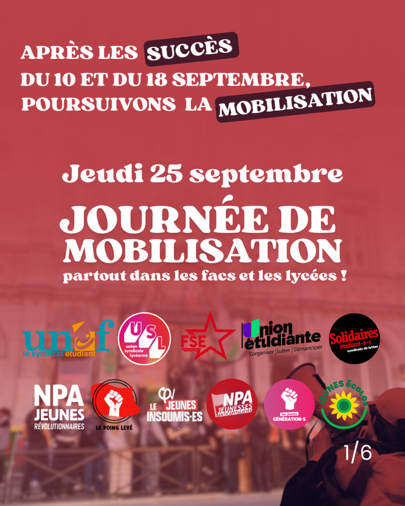 Ces journées sont de véritables points d’appui pour aller vers un mouvement d’ensemble : à nous la jeunesse de construire et développer la combativité des mobilisations et des grèves partout sur nos lieux de vie, d’études et de travail. Nous n’attendons rien du gouvernement Macron-Lecornu, il doit dégager lui et toute sa politique pro-patronale!