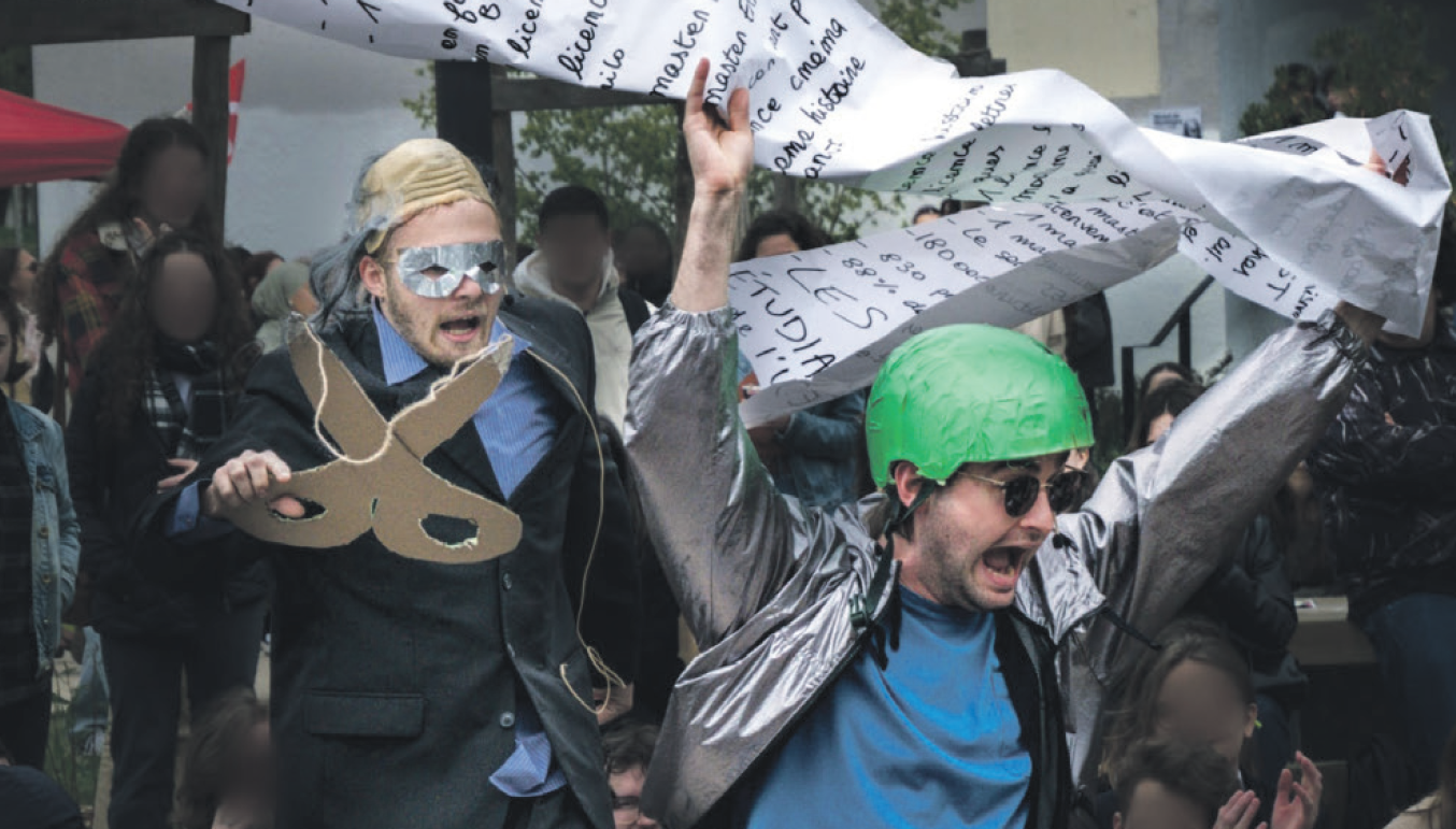 Le jeudi suivant, un carnaval des étudiants mobilisés défilait sur le campus avant de mener une représentation théâtrale, suivie par plus de 400 personnes, où le personnage du président, armé d’une grosse paire de ciseaux et accompagné par le ministre de l’ESR, tente de licencier les employés les uns après les autres… avant qu’ils s’unissent pour le licencier, lui.