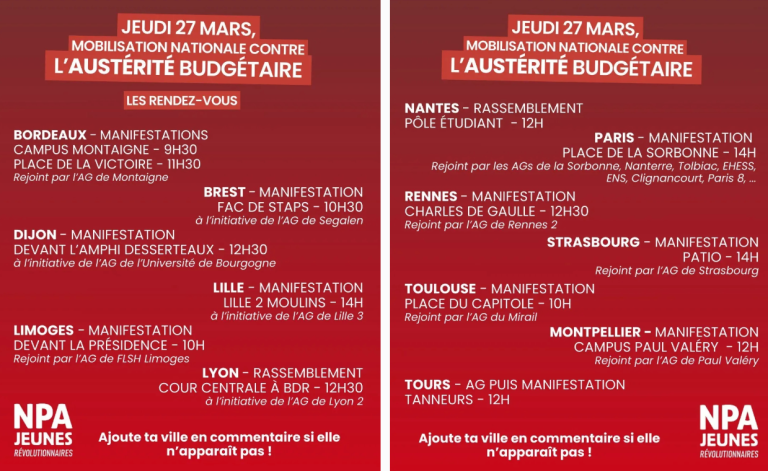 Appel unitaire pour le 27 mars : UNEF, Union Étudiante, FSE, Solidaires Étudiant·e·s, NPA Jeunes Révolutionnaires, Jeunes Insoumis, Le Poing Levé, Jeunes Écologistes, Jeunes Génération·s, Fédération des Jeunes Révolutionnaires, Jeunesses Anticapitalistes