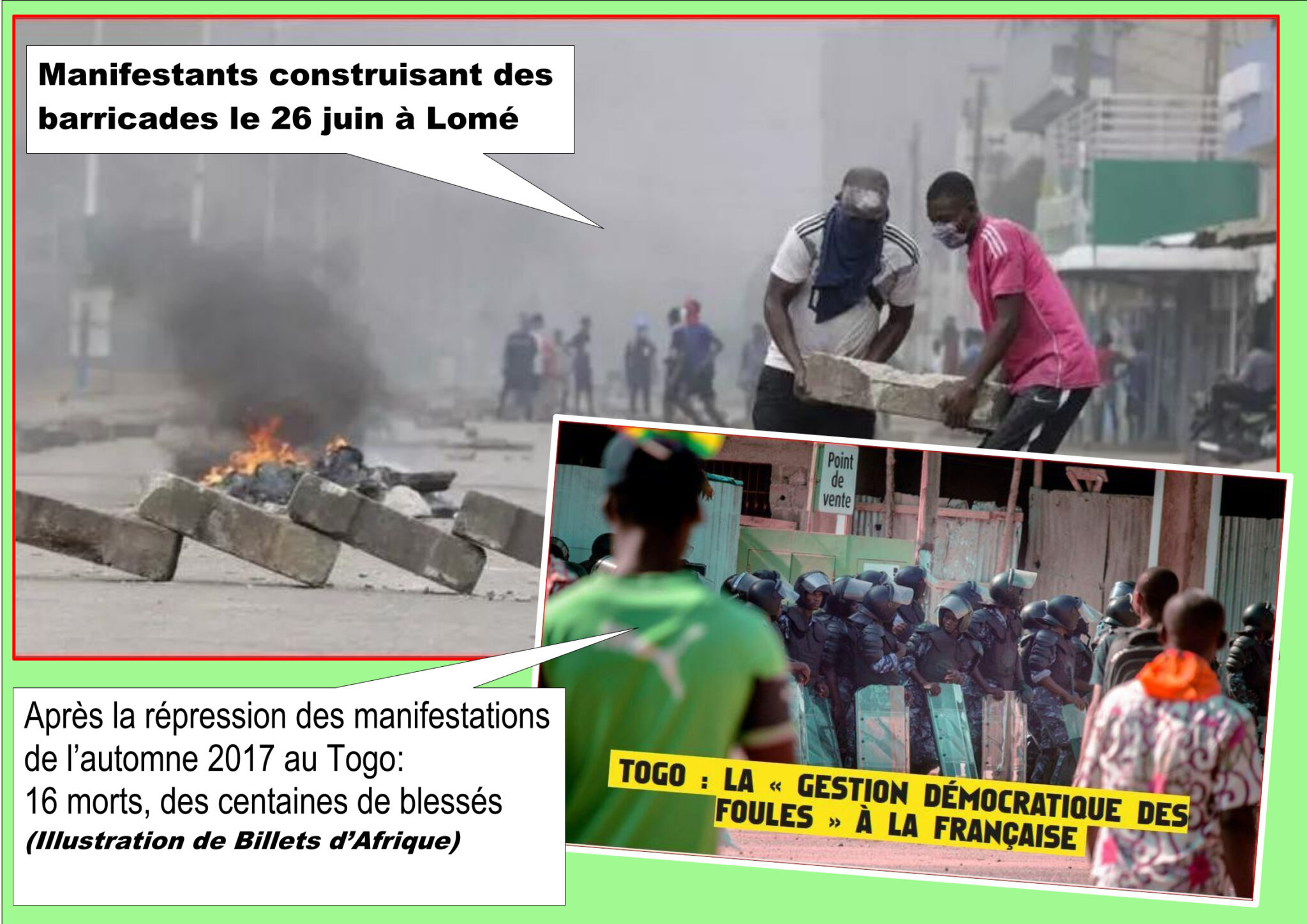 Les forces de l’ordre et miliciens du régime en civil ont fait au moins sept morts, des dizaines de blessés et de nombreuses arrestations lors des manifestations à Lomé, capitale du Togo : des explosions de colère spontanées qui ont duré trois jours du 26 au 28 juin.