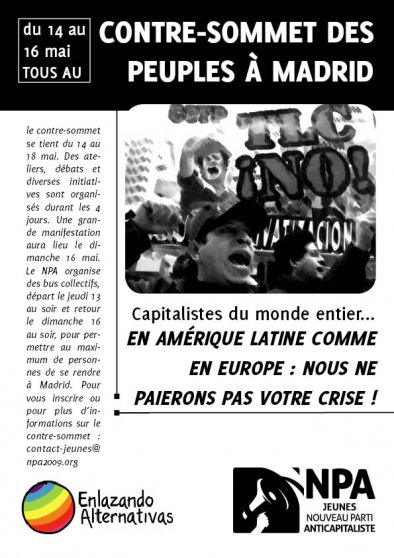 Le contre-sommet se tient du 14 au 18 mai. Des ateliers, débats et diverses initiatives sont organisés durant les 4 jours. Une grande manifestation aura lieu le dimanche 16 mai. Le NPA organise des bus collectifs, départ le jeudi 13 au soir et retour le dimanche 16 au soir, pour permettre au maximum de personnes de se rendre à Madrid. Pour vous inscrire ou pour plus d’informations sur le contre-sommet : contact-jeunes@npa2009.org