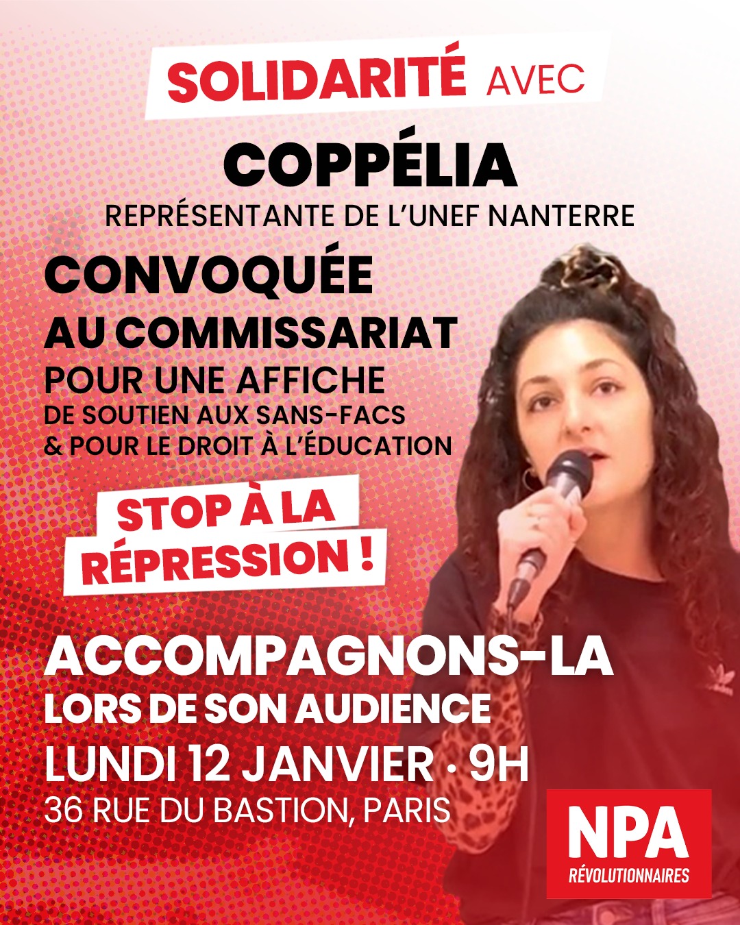 Coppélia, représentante du syndicat, est convoquée le 12 janvier au commissariat pour y être auditionnée. Le NPA-Révolutionnaires se joint à l’appel à la mobilisation à 9 heures au 36 rue du Bastion, à Paris. Nous n’accepterons aucune poursuite !