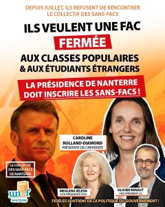 La présidence de la fac de Nanterre s’est vexée et a porté plainte en diffamation contre l’Unef Nanterre pour une affiche dénonçant sa politique de tri social et autoritaire en la comparant à Macron. Elle réprime car elle craint les mobilisations dans sa fac !