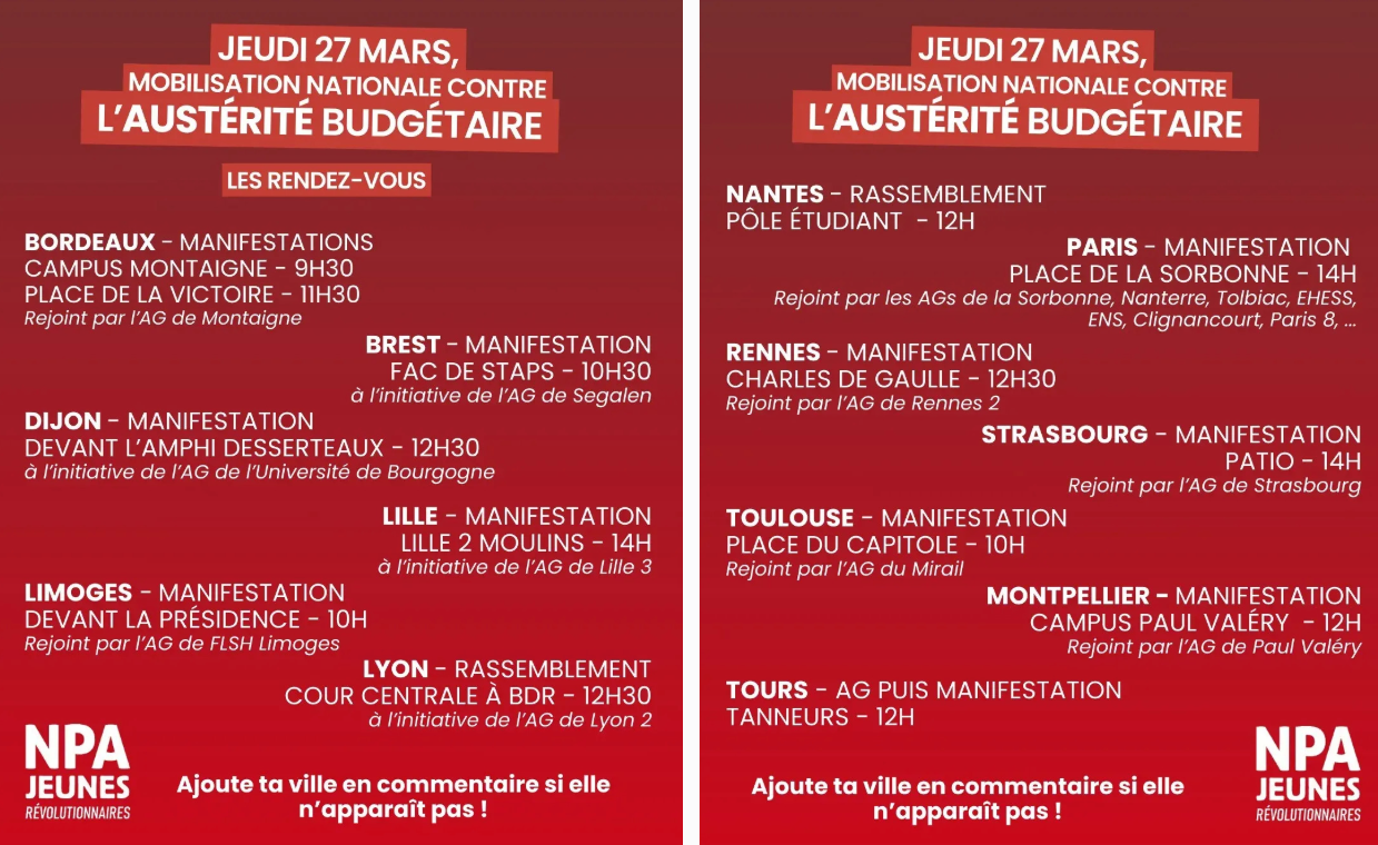 Recensement des mobilisations du 27 mars 2025NPA Jeunes Révolutionnaires26/03/20252025 - Mobilisation budgets universitaires, Actualités & campagnes, Jeunesse, Jeunesse scolarisée, Luttes, mobilisations, et mouvements de masse, Matériel, Situation Nationale, Universités / ESR 13 rassemblements et manifestations recensé·e·s pour le 27 mars Article précédent En Allemagne quelles perspectives face à un nouveau gouvernement réactionnaire et de casse sociale [Top WEF Mars 2025 - RSO] Article suivant L’impérialisme américain rebat les cartes au Moyen-Orient au détriment des peuples [Topo WEF Mars 2025]